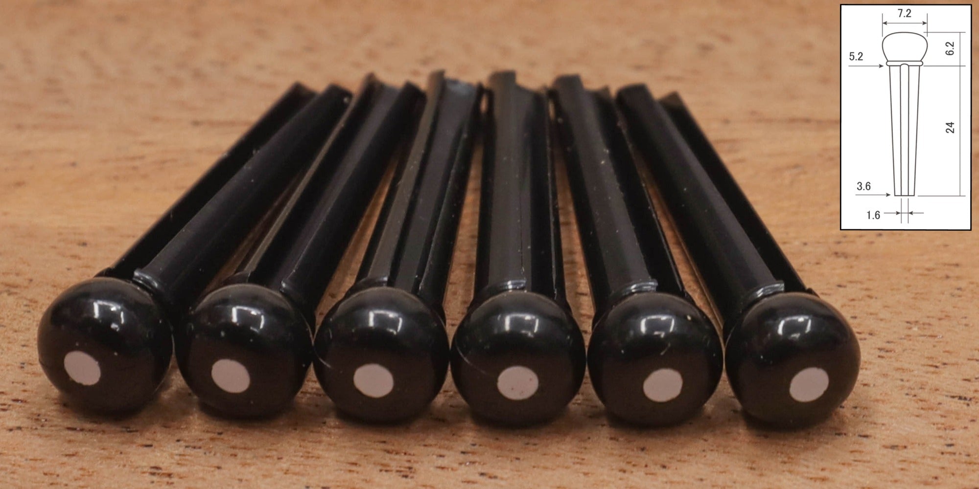 Bridge Pins, Plastic, set of 6 slotted, Black with white dot