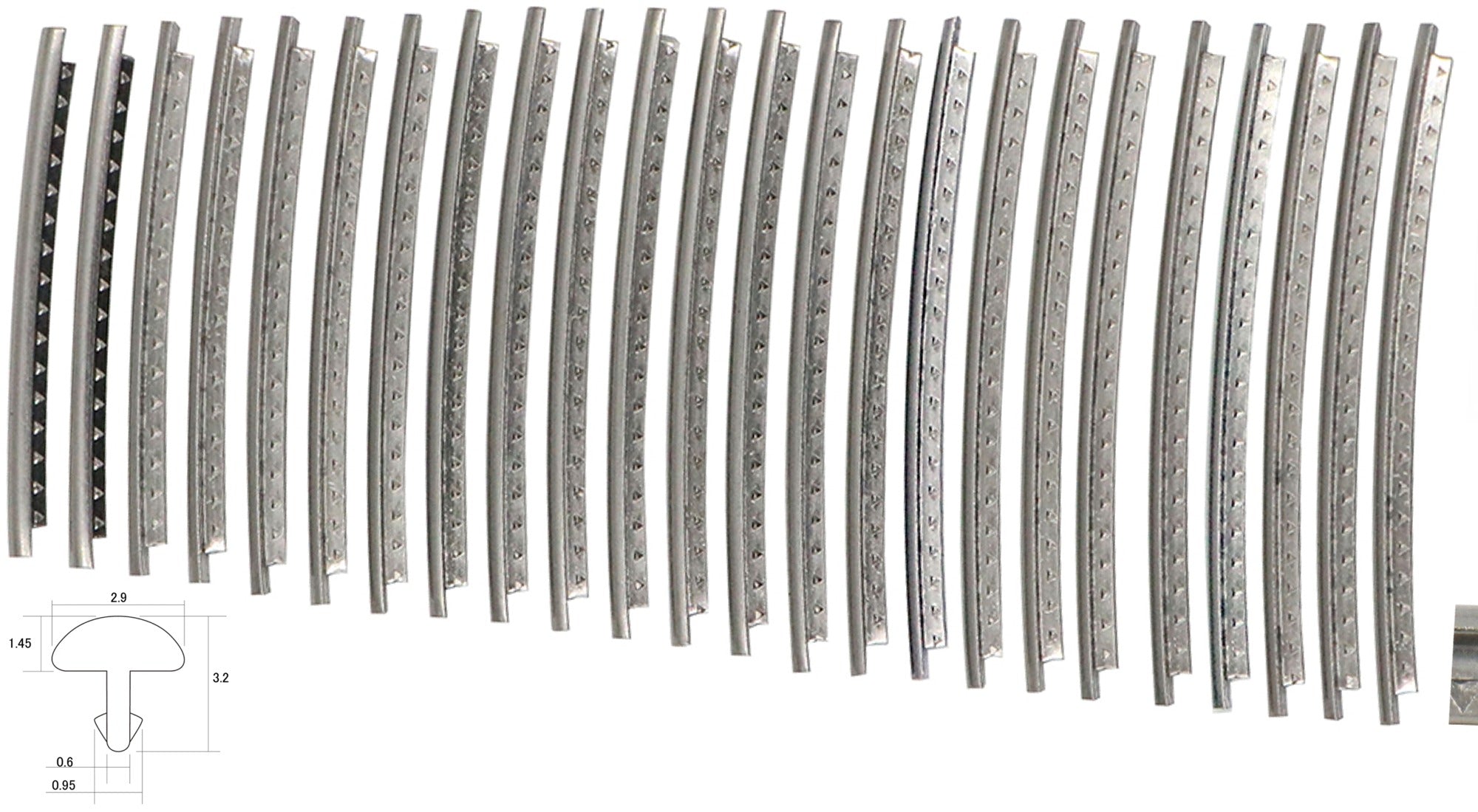 Nickel Silver fret wire (24 pre-cut pieces for one instrument), 7cm long (2-3/4”), with radius of 300mm. Jumbo size, featured heavily on modern rock guitars.