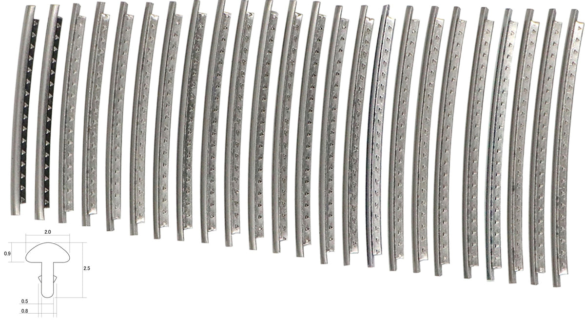 Nickel Silver fret wire (24 pre-cut pieces for one instrument), 7cm long (2-3/4”), with radius of 300mm. Small frets (for Gibson and Yamaha guitars).