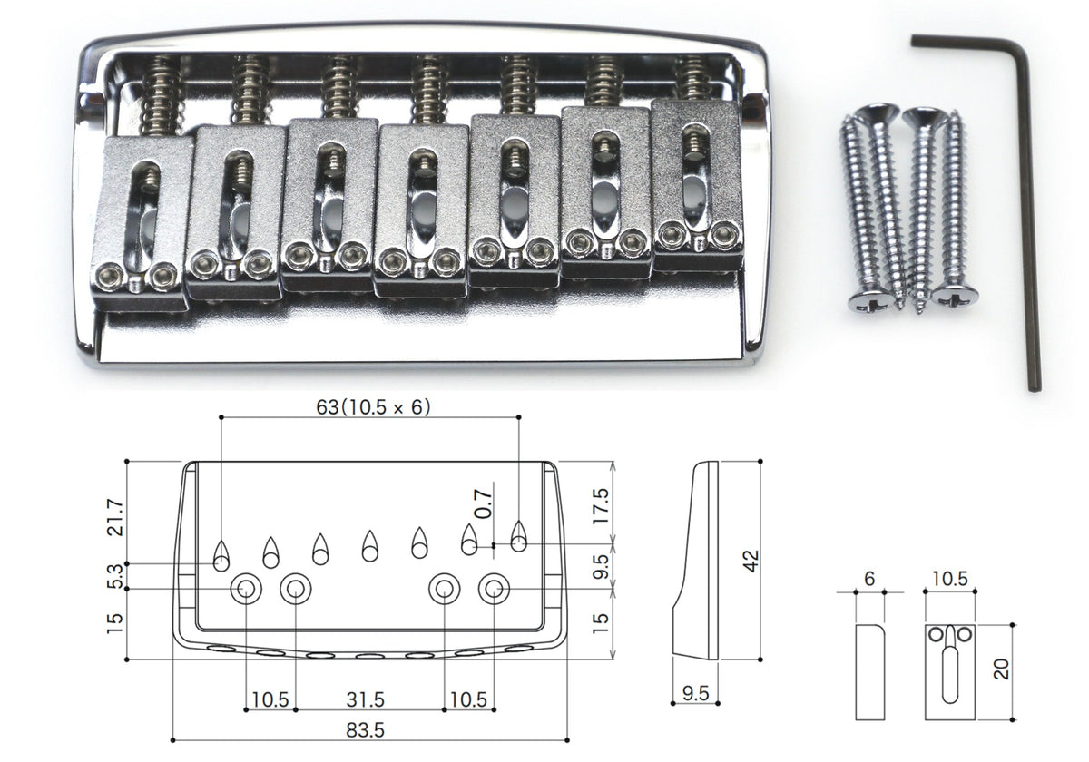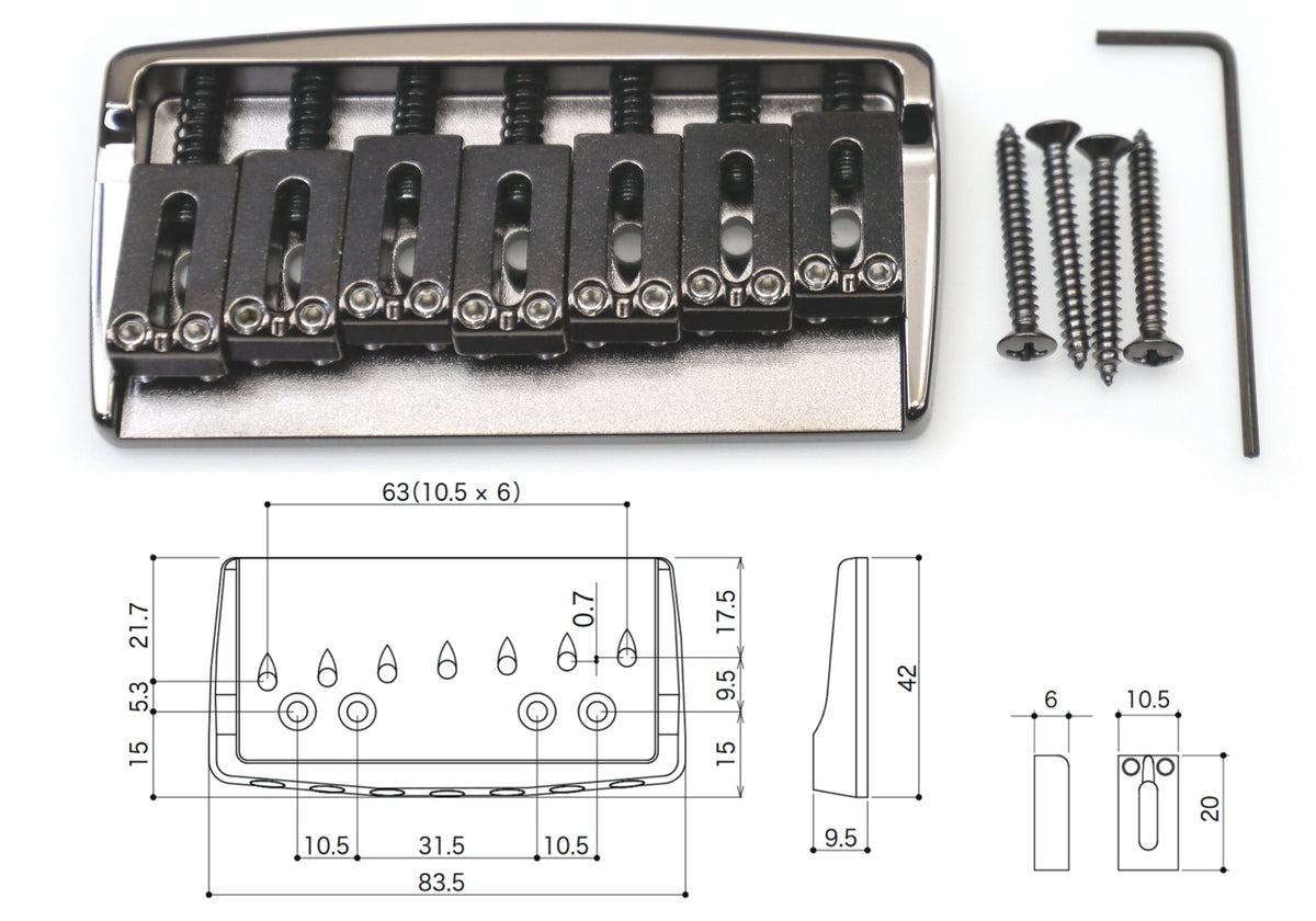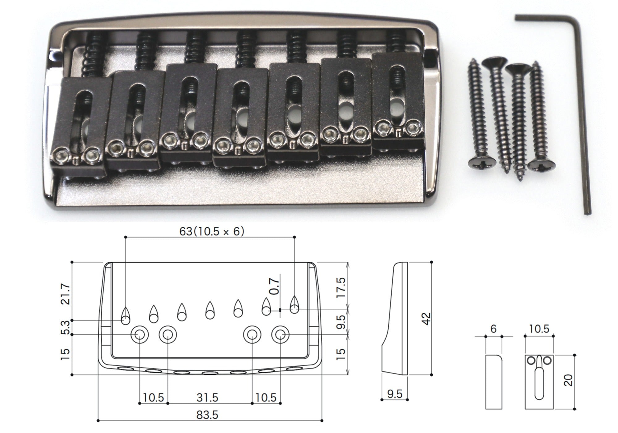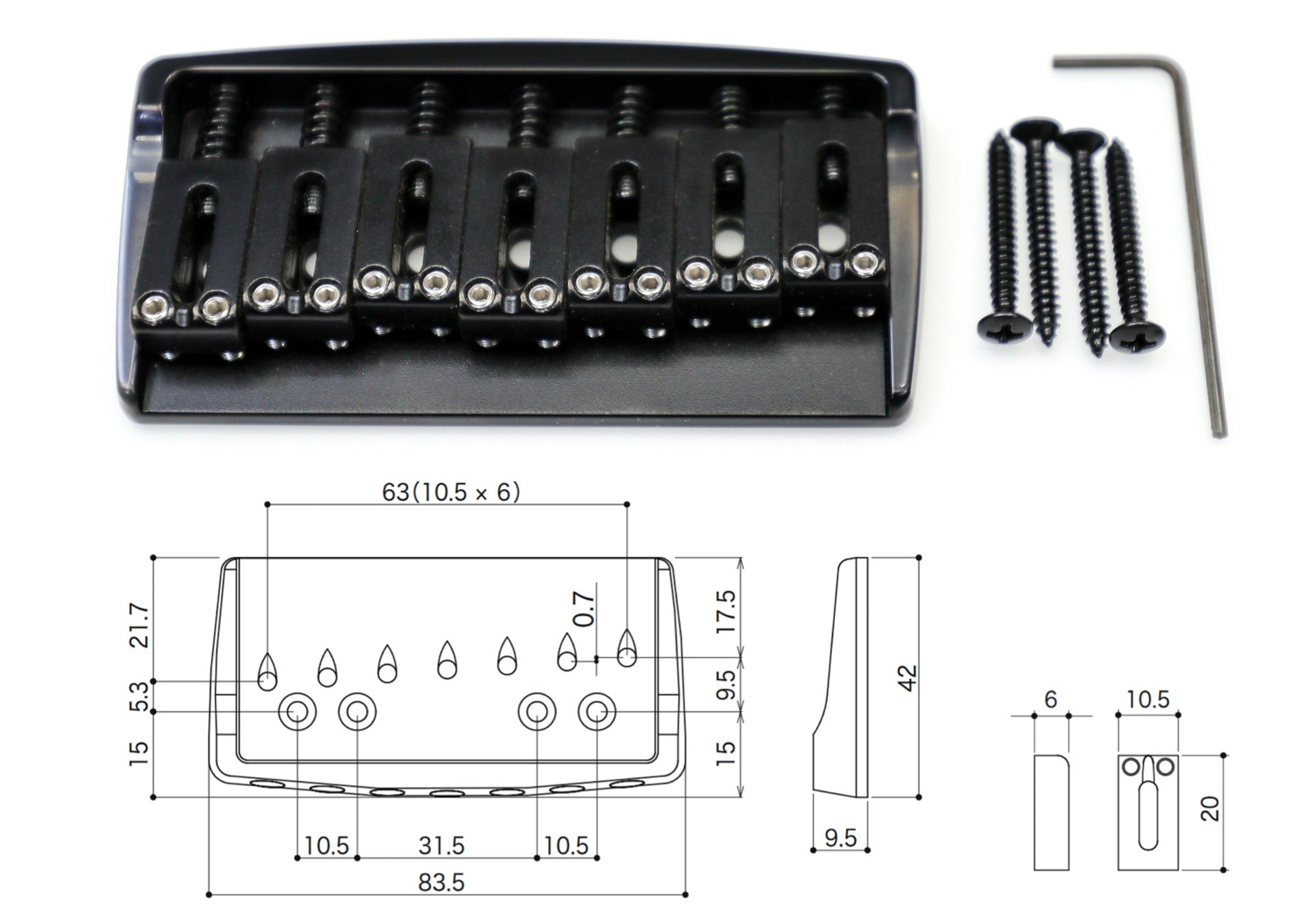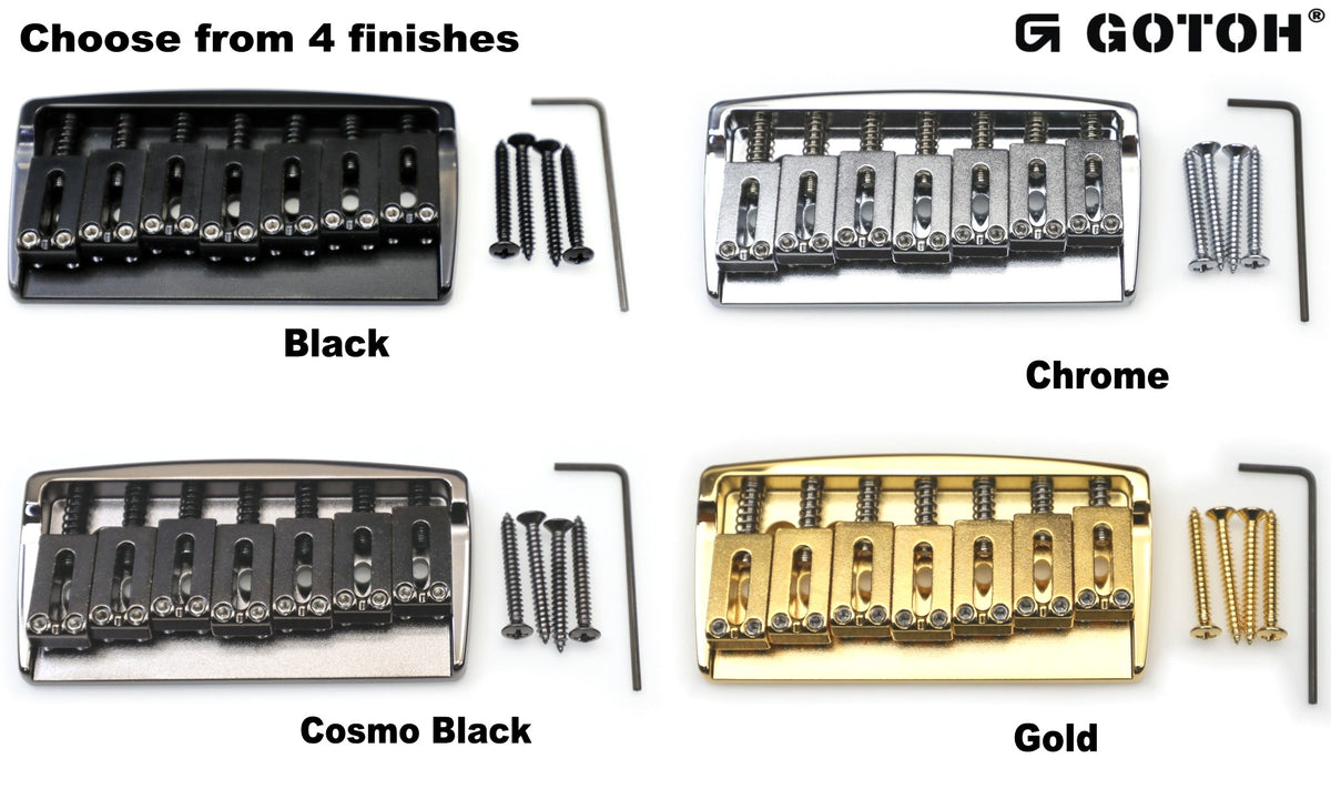 Non-tremolo Gotoh 510FX-series 7-string Hardtail Bridge with Steel Saddles, in 4 finishes: Black, Cosmo Black, Chrome and Gold.