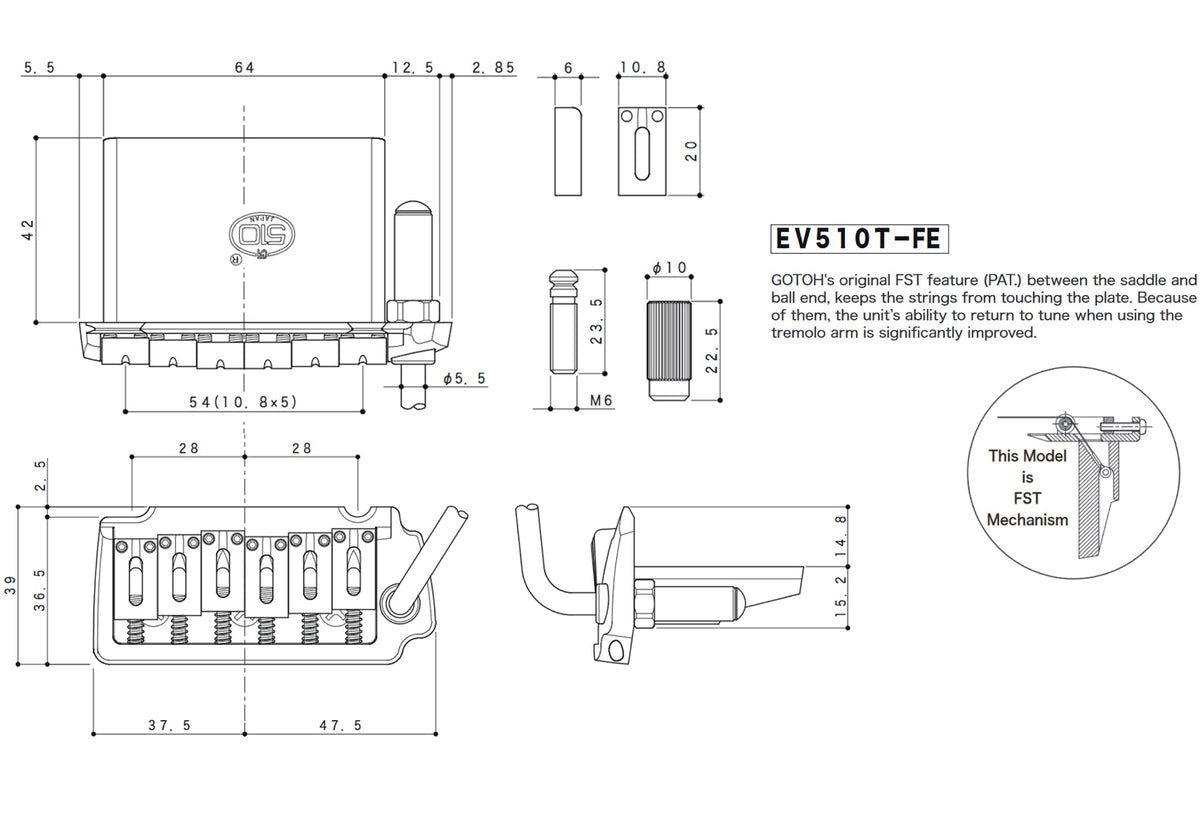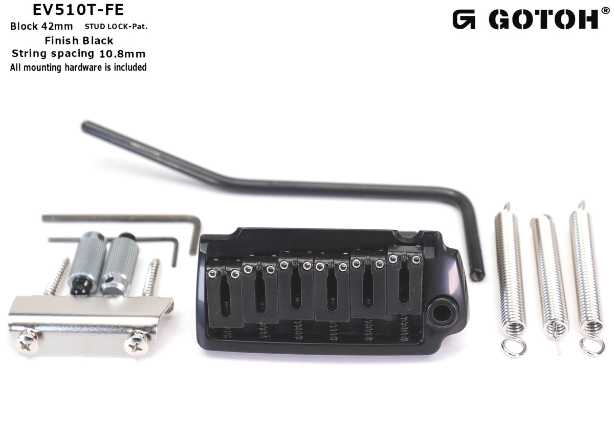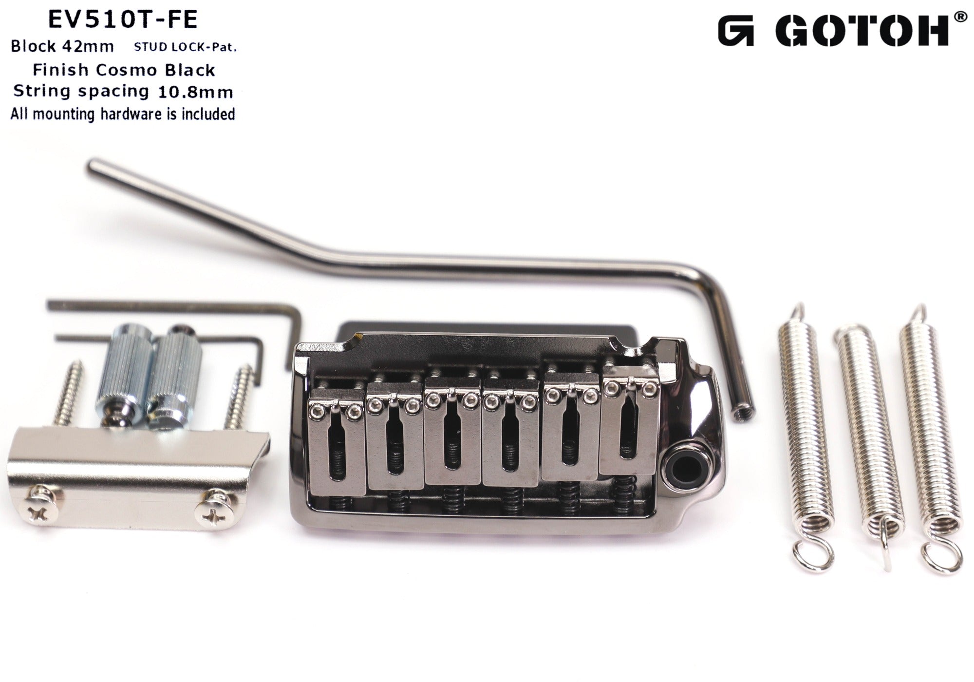 Steel tremolo Gotoh EV510T-FE Bridge with FST and 42mm block, in 4 finishes: Black, Cosmo Black, Chrome and Gold.