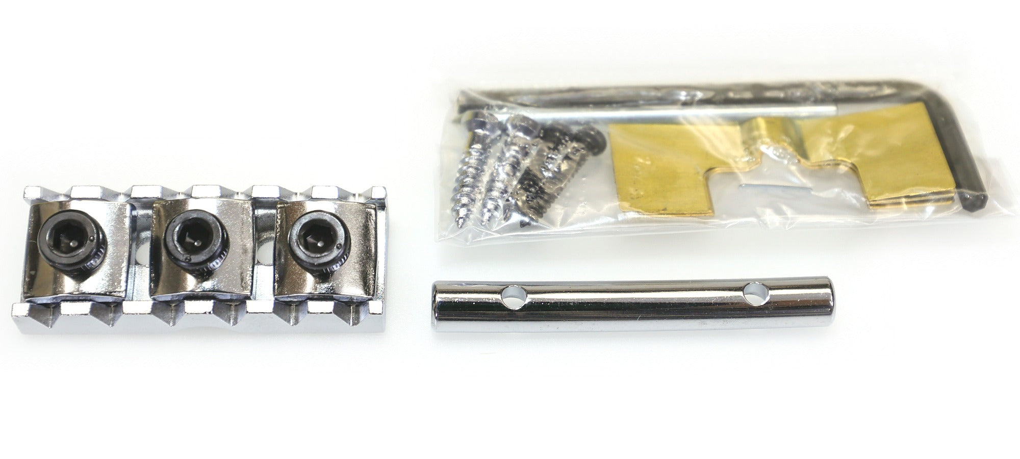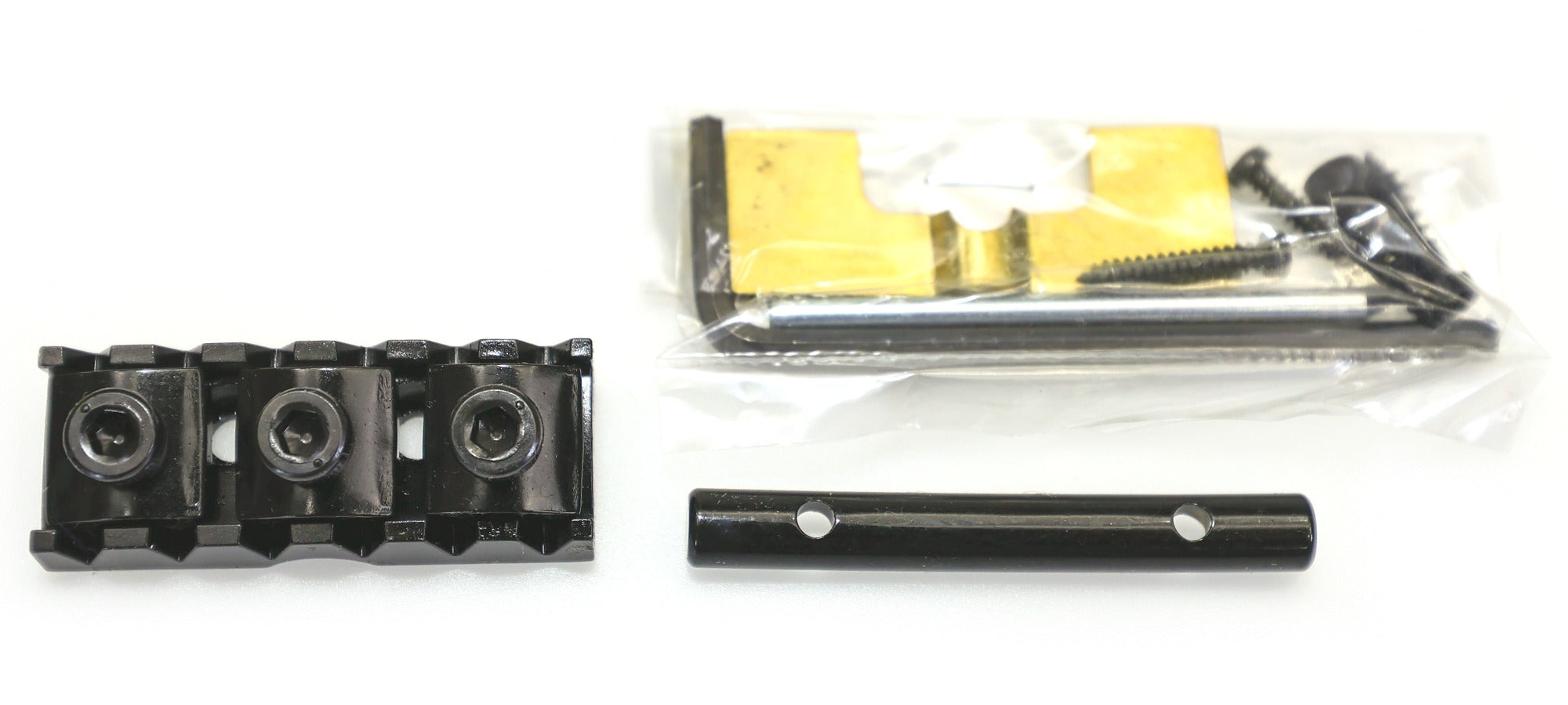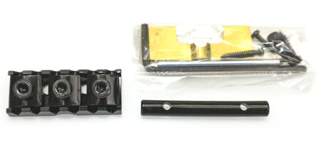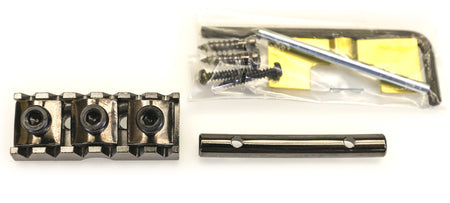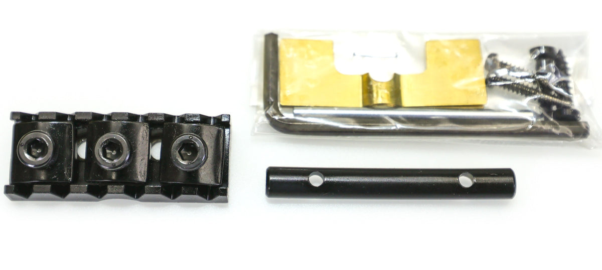 Includes a lock nut assembly with mounting hardware, string tree, 2.5mm and 3mm Allen keys, and height adjustment shims.