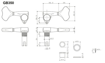 Use this tuner on guitars with inline pegs, or combine it with our GB350(CK) tuners to achieve any configuration you desire (2+2, 2+3, 3+3, etc.).