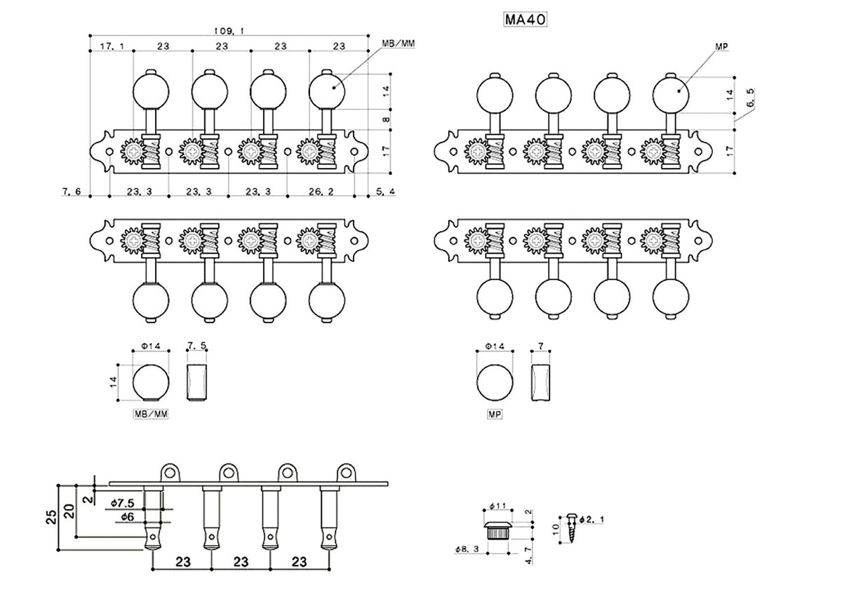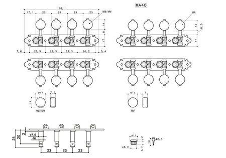 Mandolin Tuners, A-style Gotoh MA40(N)MW with Metal Rollers (Nickel)