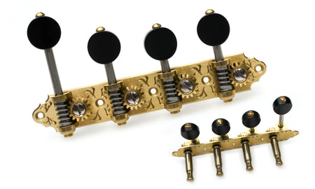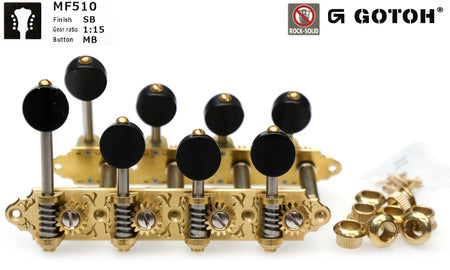 Set of Premium Gotoh MF510 series Mandolin tuners, made of Solid Brass, with Black Plastic knobs and Metal Rollers.