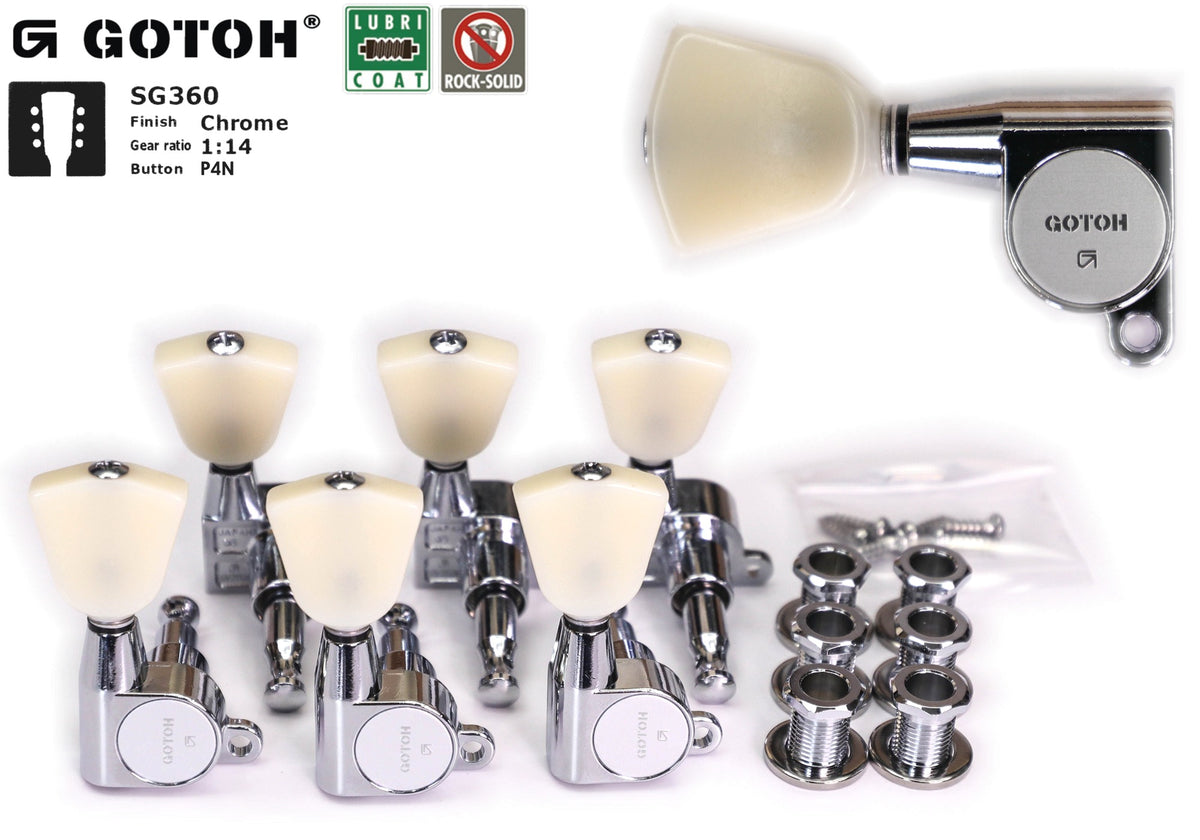 Set of six (3+3) Gotoh SG360 sealed-gear tuners, Chrome finish.