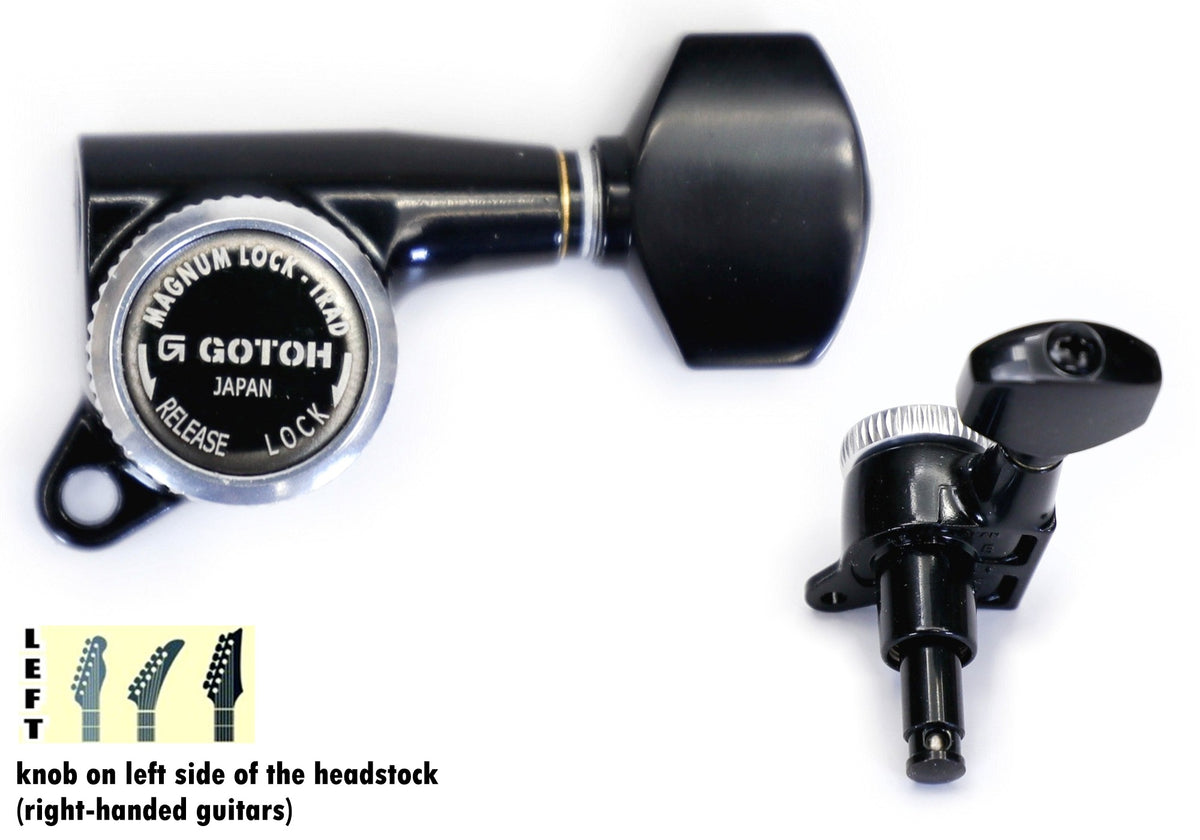 Set of six Gotoh SG381 sealed-gear tuners, Black finish, with Magnum Lock-Trad (traditional thumbscrews locking string posts).