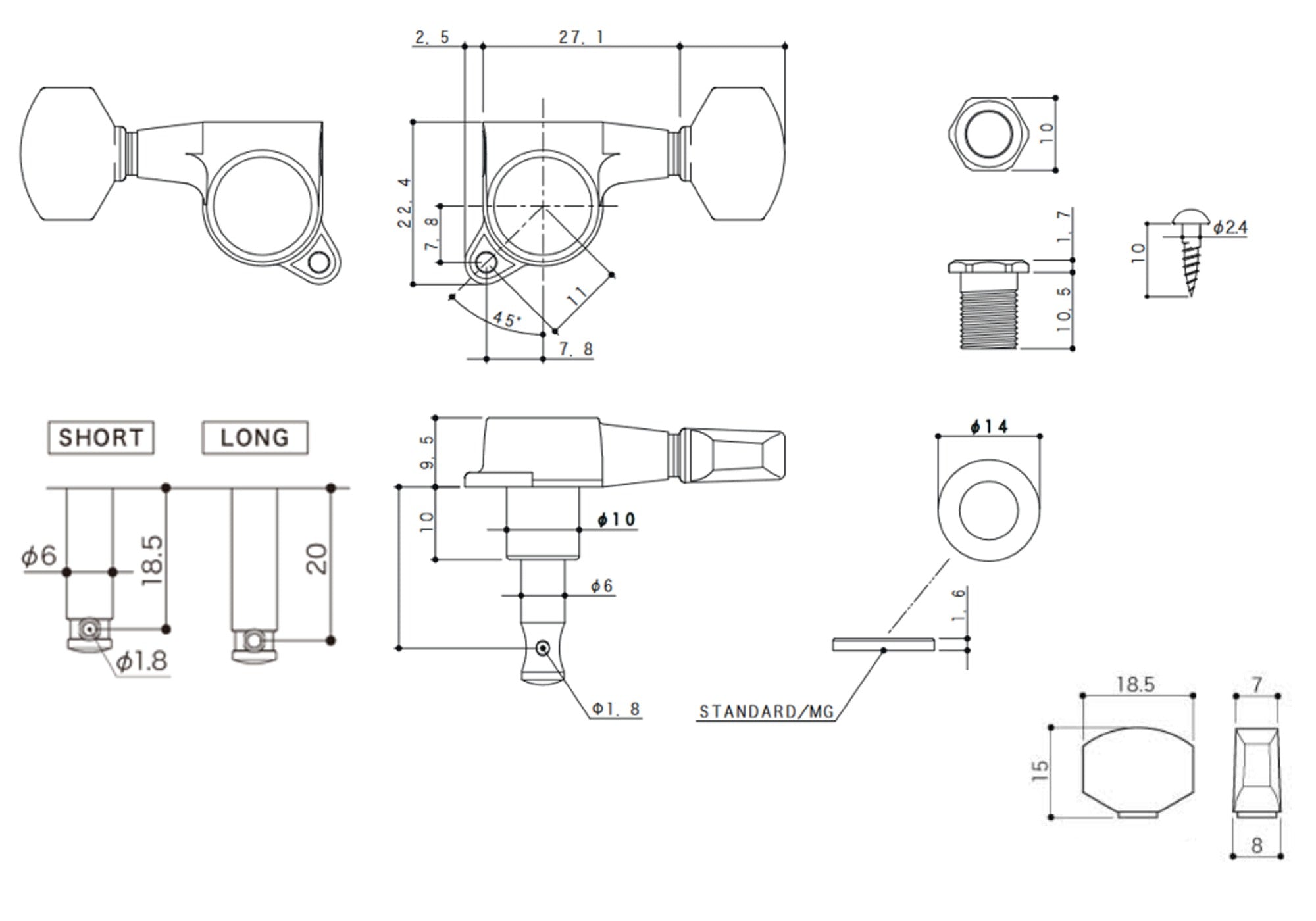 6 inline Left for Right-Handed Guitars (3 posts 18.5mm long, 3 posts 20mm long).