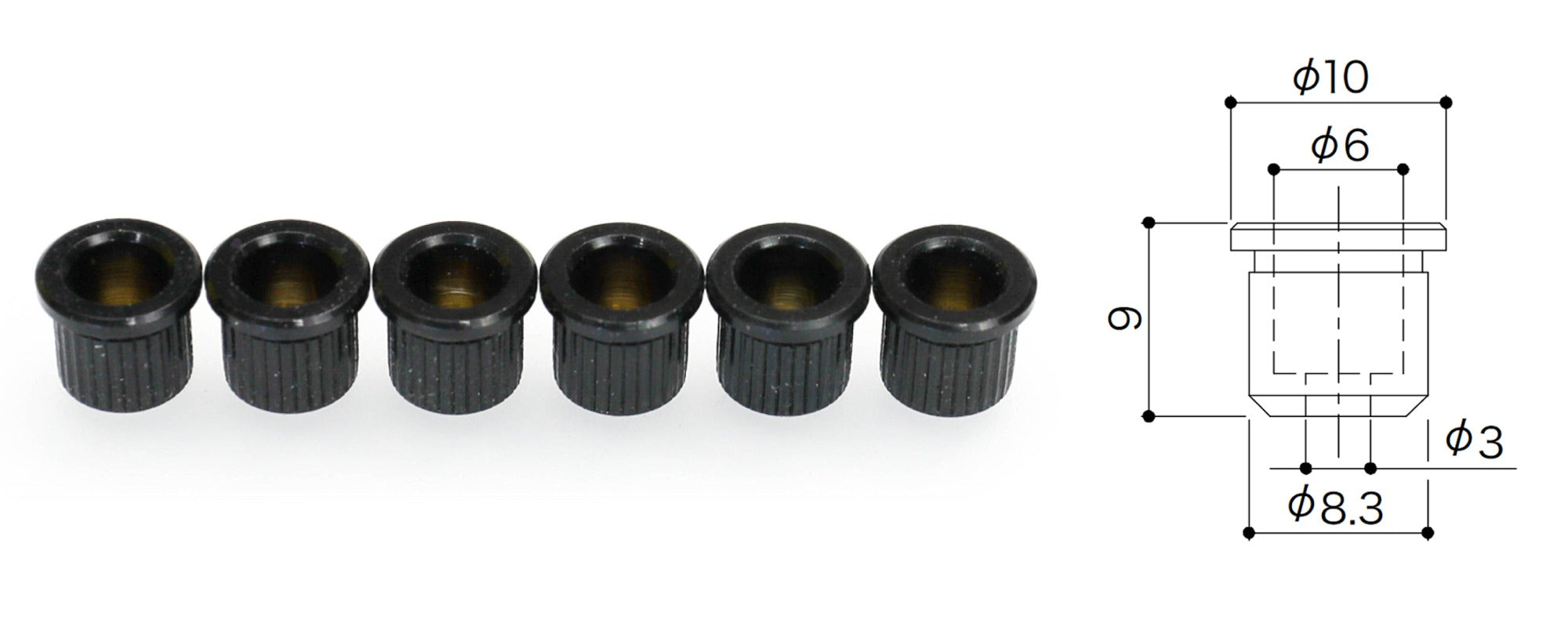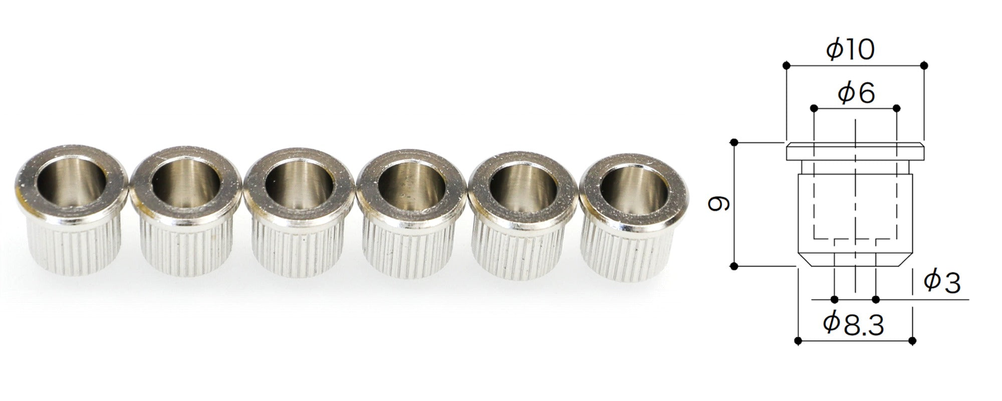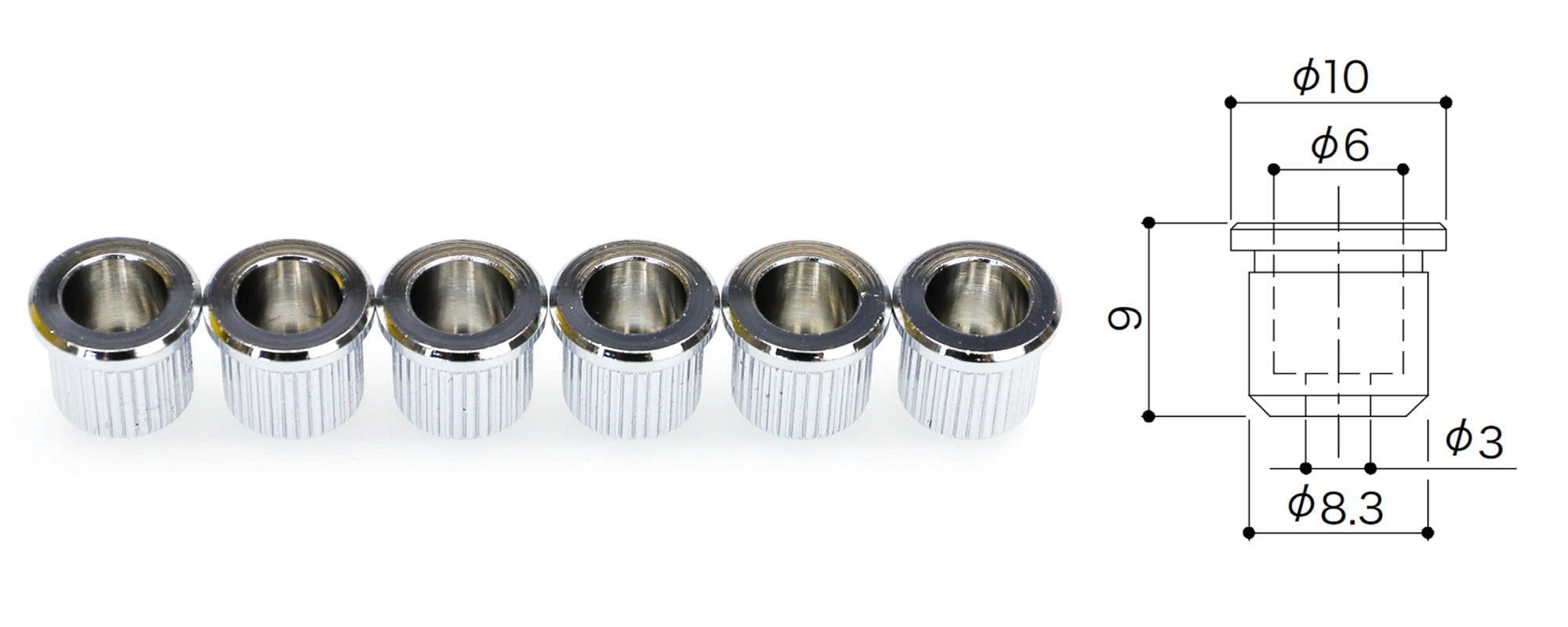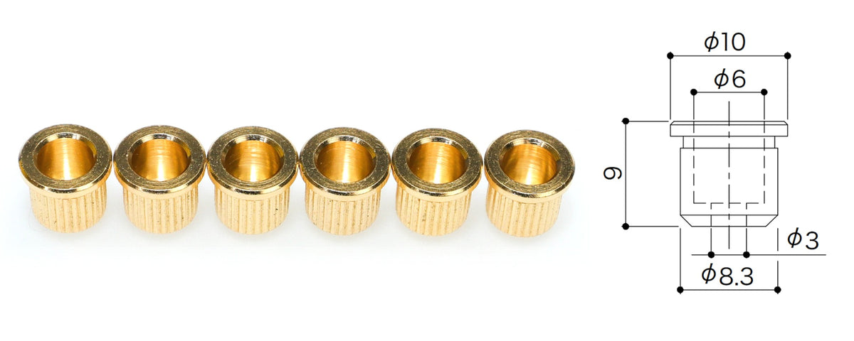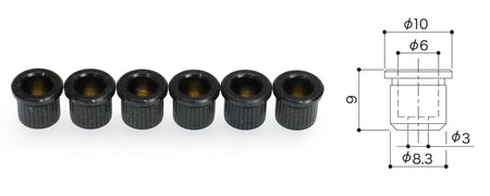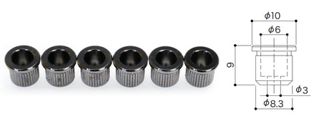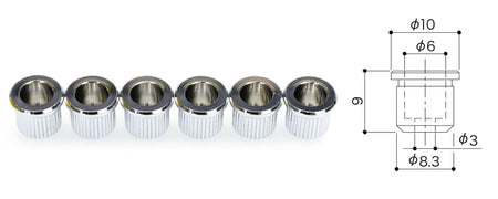 Set of 6 Guitar String Ferrules with lip, for mounting the strings through the body.