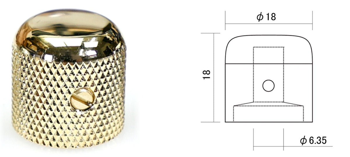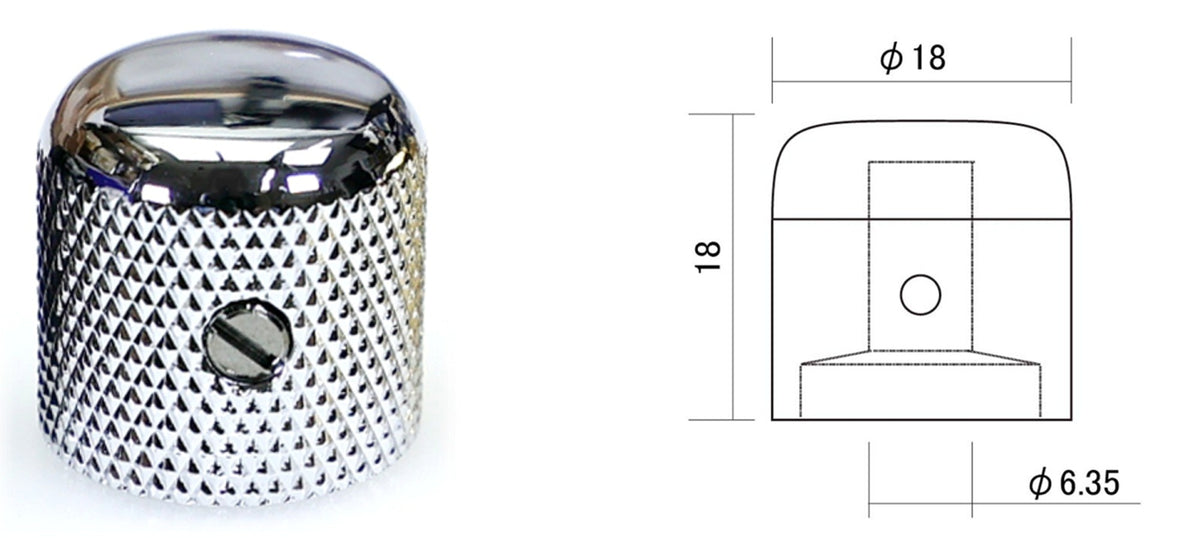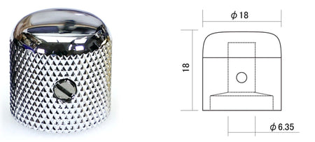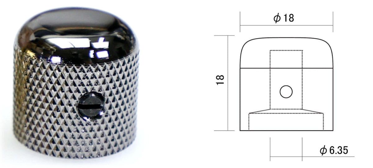 All metal construction with a knurled edge to give grip and a set screw to tighten it onto the potentiometer.