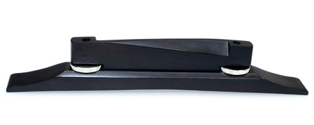Machined Ebony bridge for archtop guitars, with Nickel thumbwheel. The saddle is unnotched.