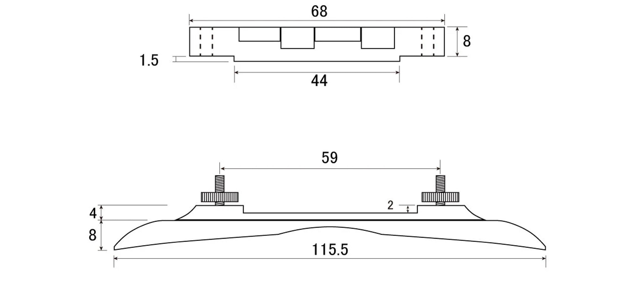Machined Ebony bridge for mandolins. Compensated, with Nickel thumbwheel. The saddle is unnotched.