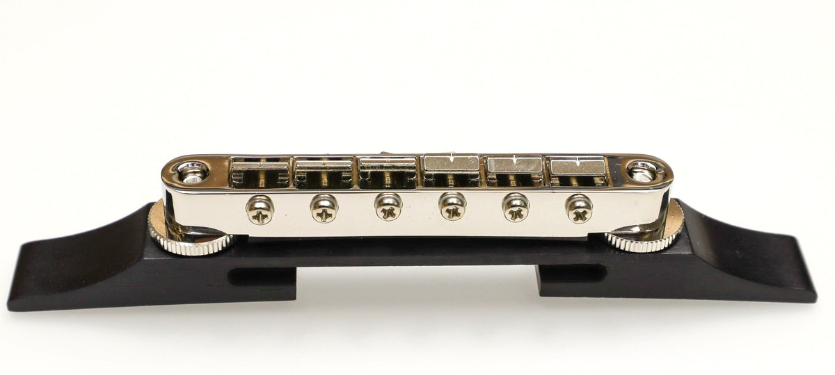 Machined Ebony bridge for archtop guitars, with Tune-O-Matic bridge & saddle, Nickel finish.