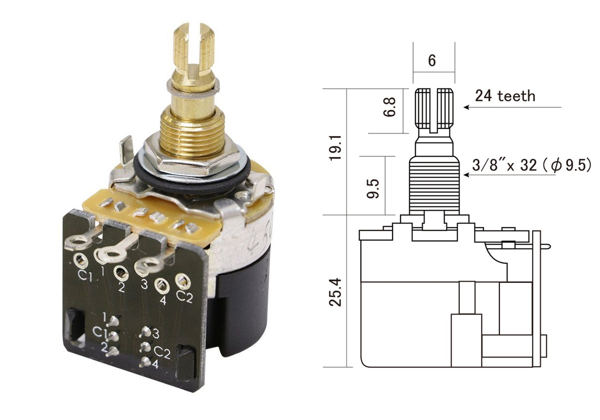 1 Push/Pull DPDT Potentiometer with 24 teeth Knurled Split shaft.