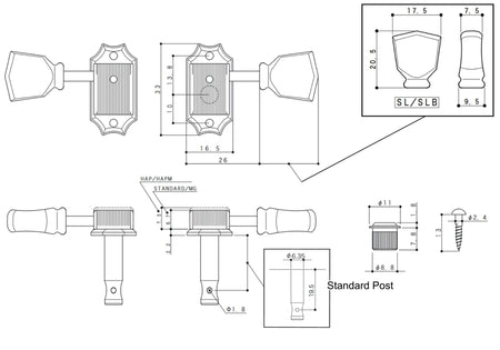 Gotoh SD90(G)SL Tuners with Standard 19.5mm Post, 3L+3R (Gold)