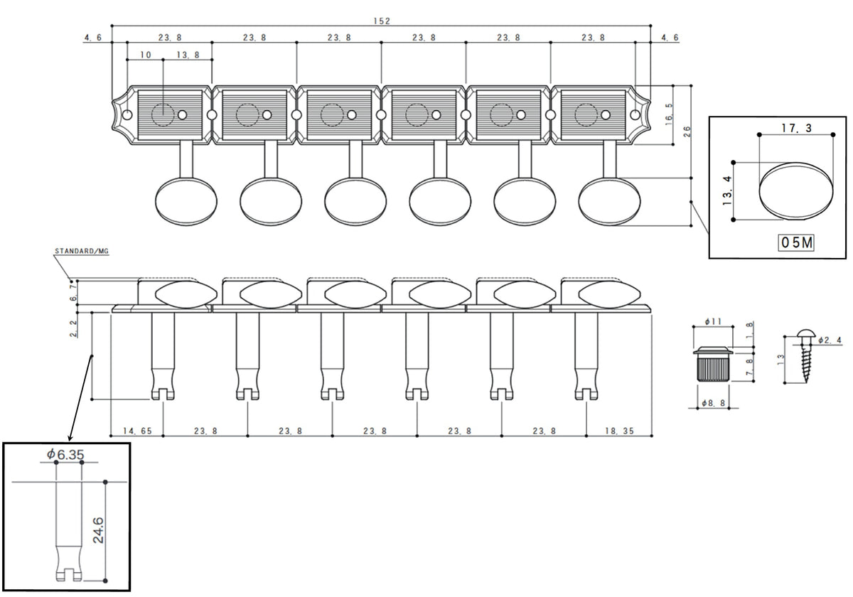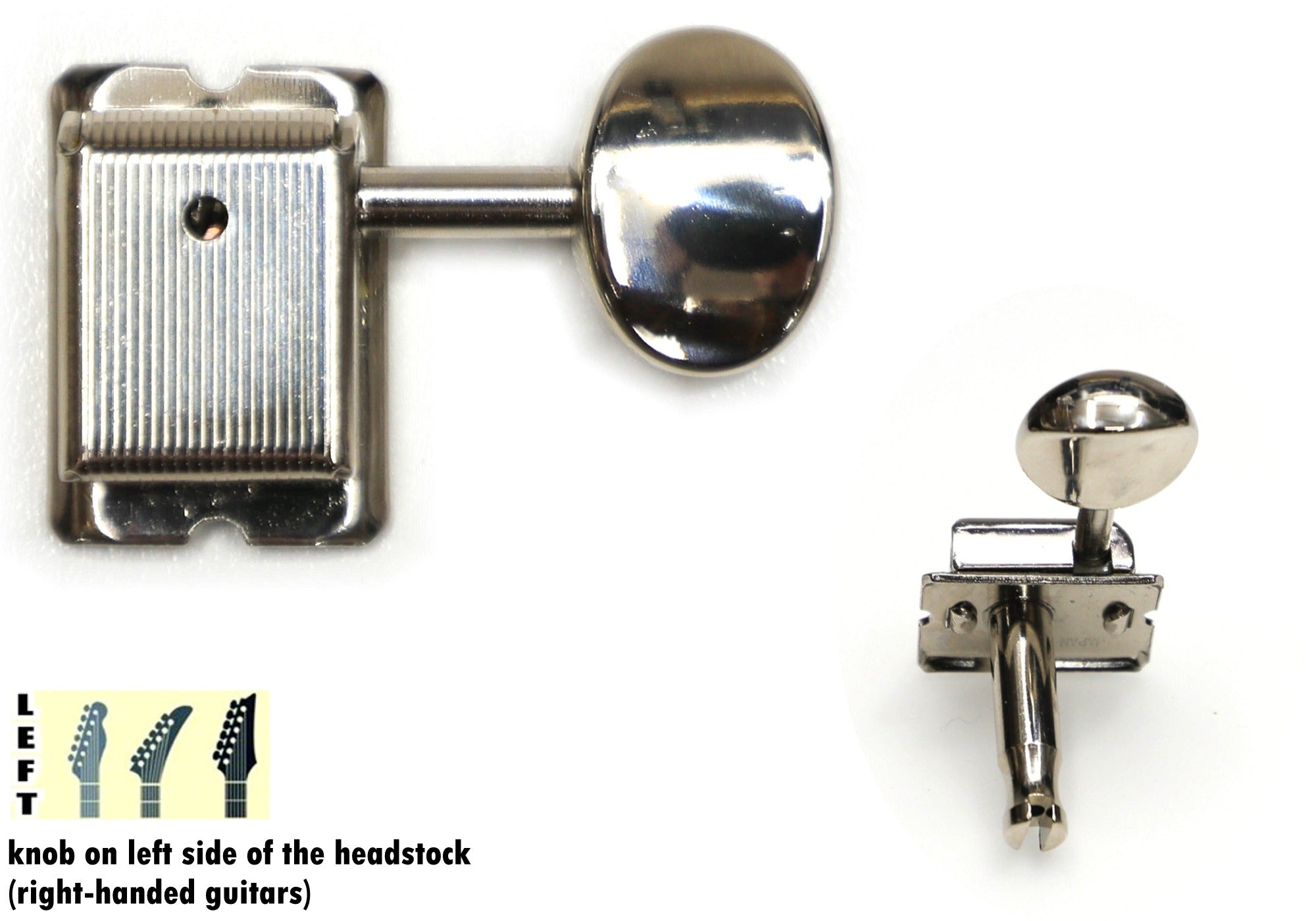 Vintage Closed-Back Tuners, Nickel Finish, Metal (Zinc) knobs, complete set including bushings and screws (two sets of bushings: 8.8mm and 9.2mm are included).
