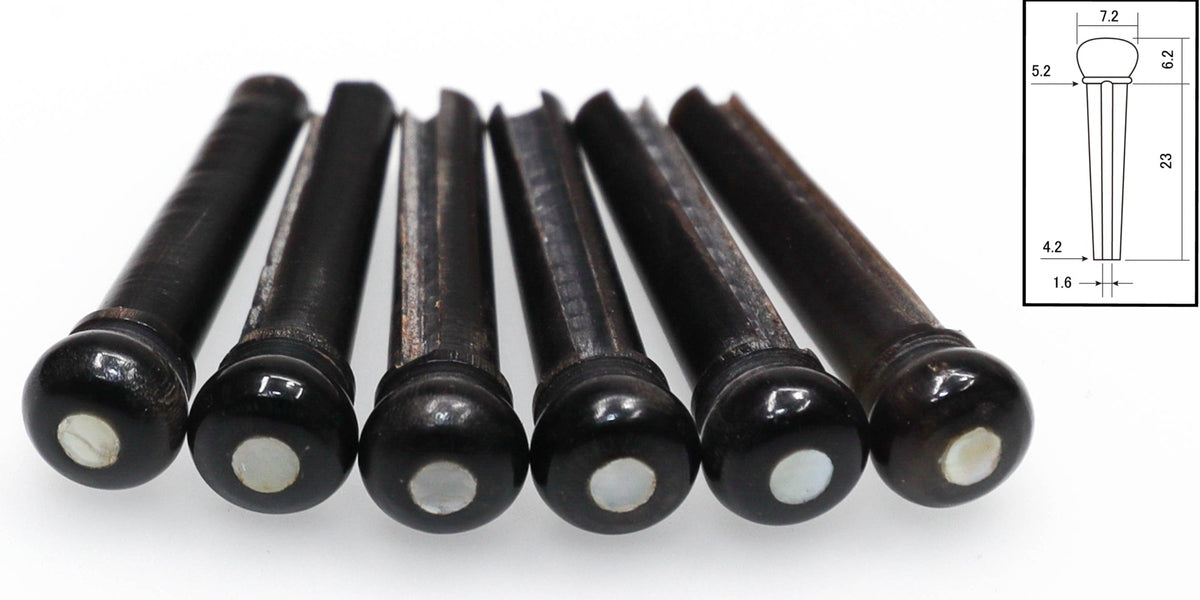 6 Buffalo Horn Bridge Pins with 3mm Mother of Pearl dot, slotted.