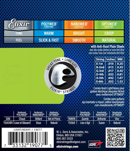 Elixir Electric Guitar Strings, Nickel Plated Steel, Optiweb Coated, Light/Heavy 19077 (10-52)
