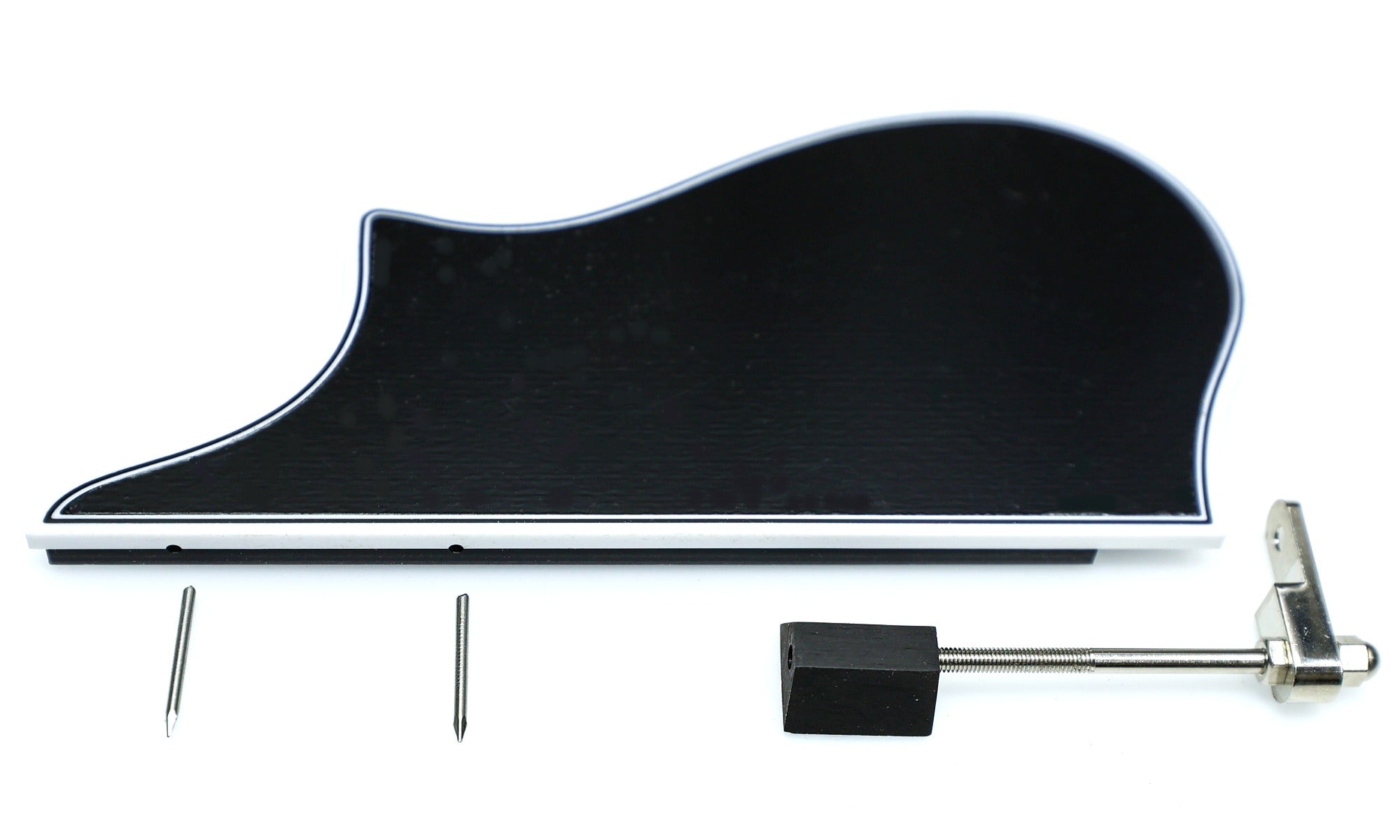 The pickguard has a reinforcing strip on the underside (the top end may need shaping to accommodate the raised part of the body where it meets the fretboard) and is pre-drilled for the mounting pins that press into the side of the fretboard.