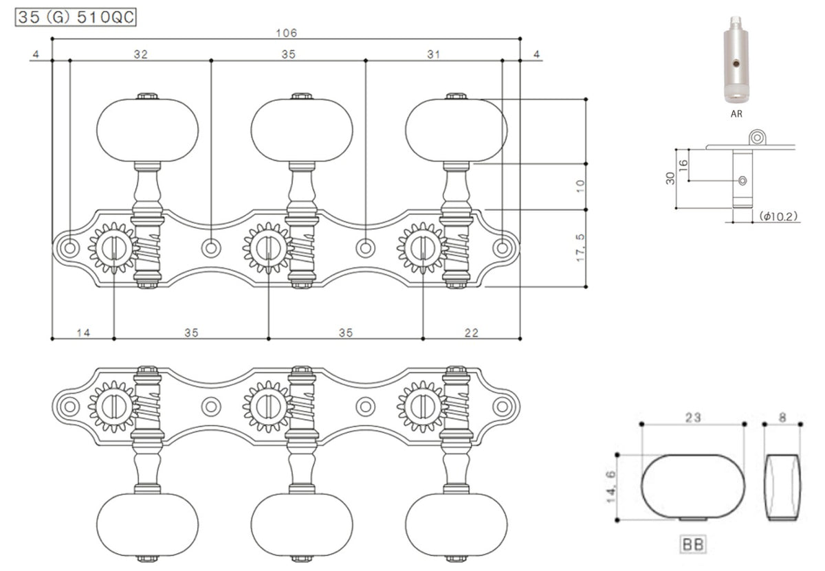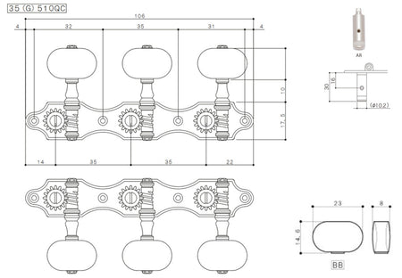 The rollers and knobs in the 35G510QC series are interchangeable (35AR,35ARB,35P) so any of the tuners listed in this lot can have their Knobs and Posts swapped to achieve the look you’re after – please don’t hesitate to ask us if you cannot find the right combination in stock.