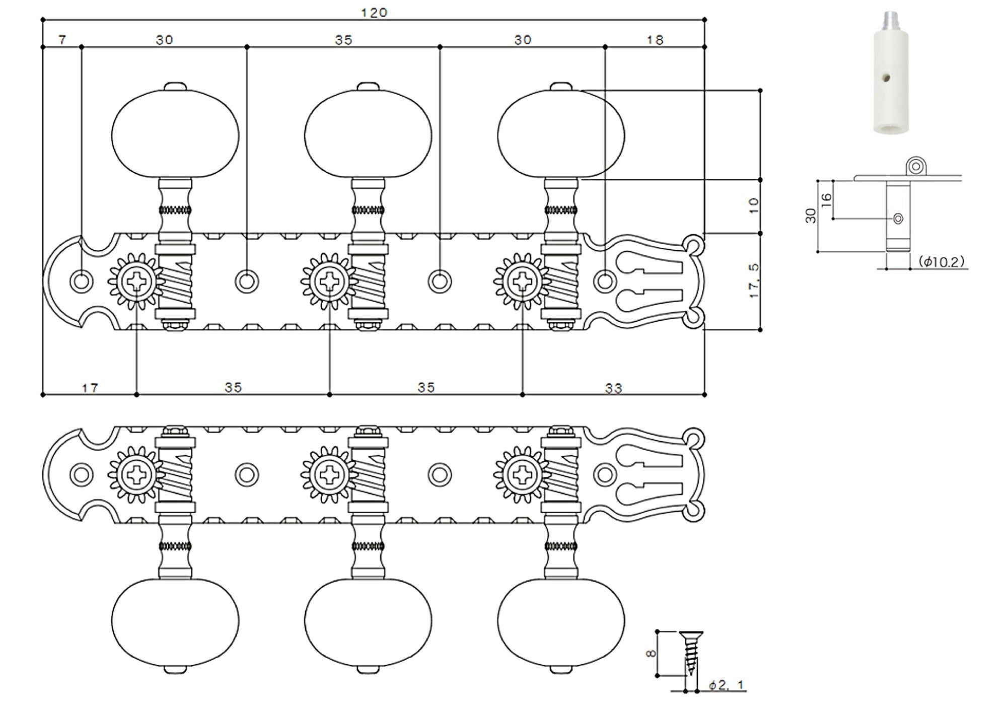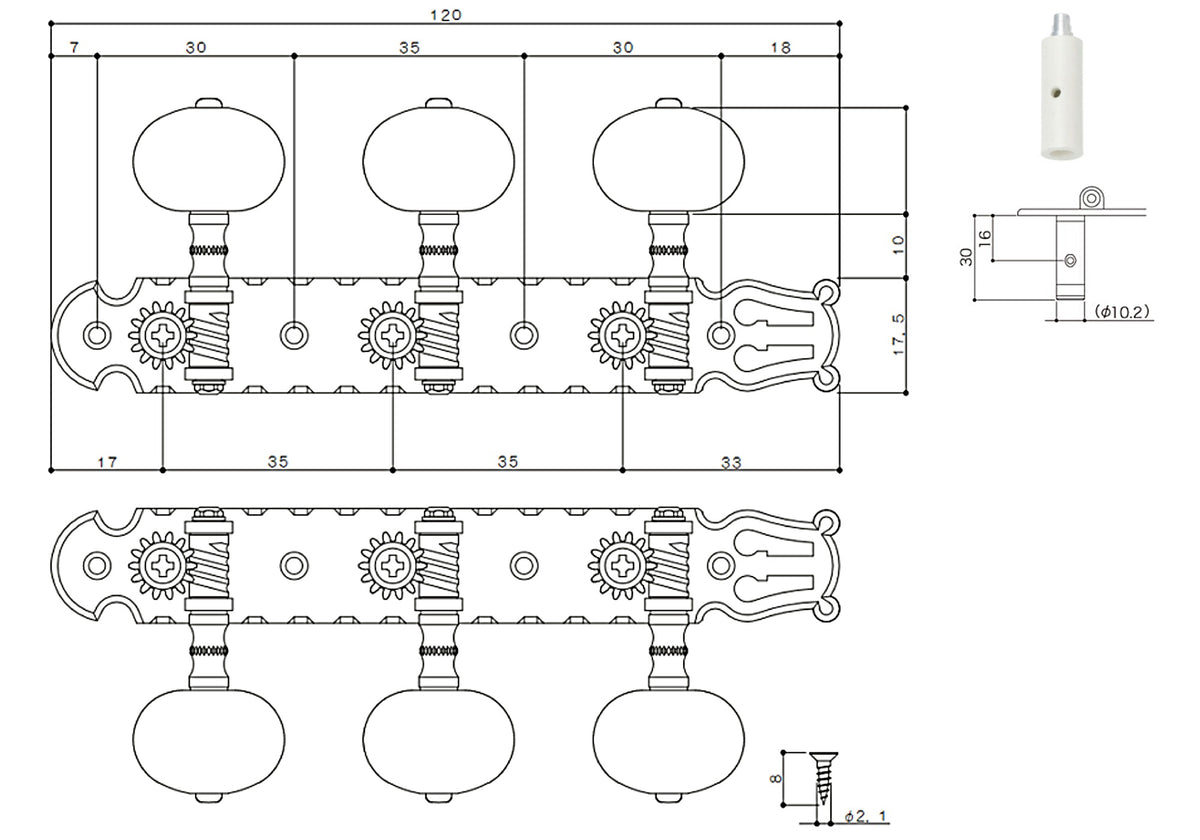 Solid Brass, Ebony Wood knobs, Plastic Rollers, complete set.