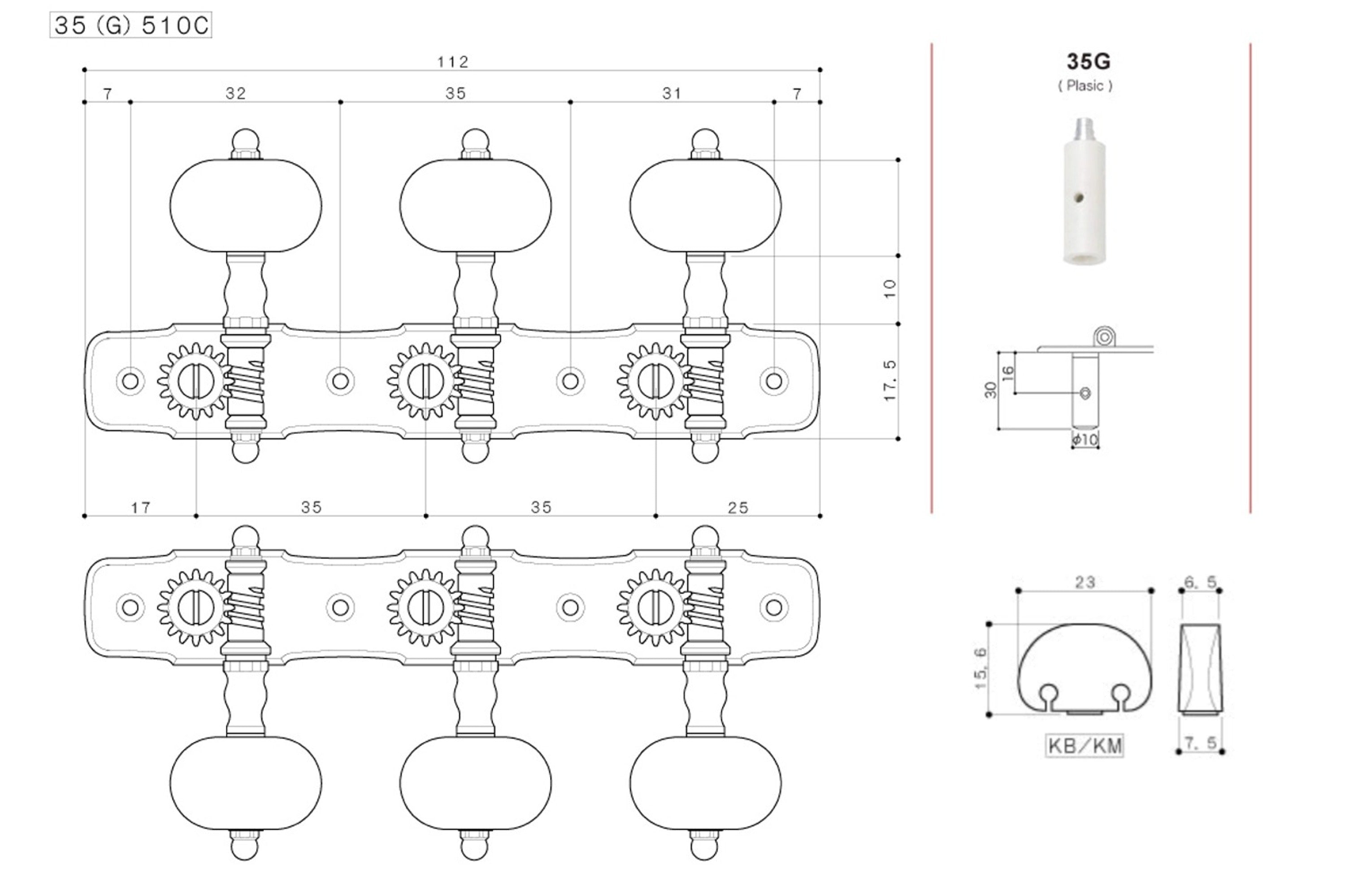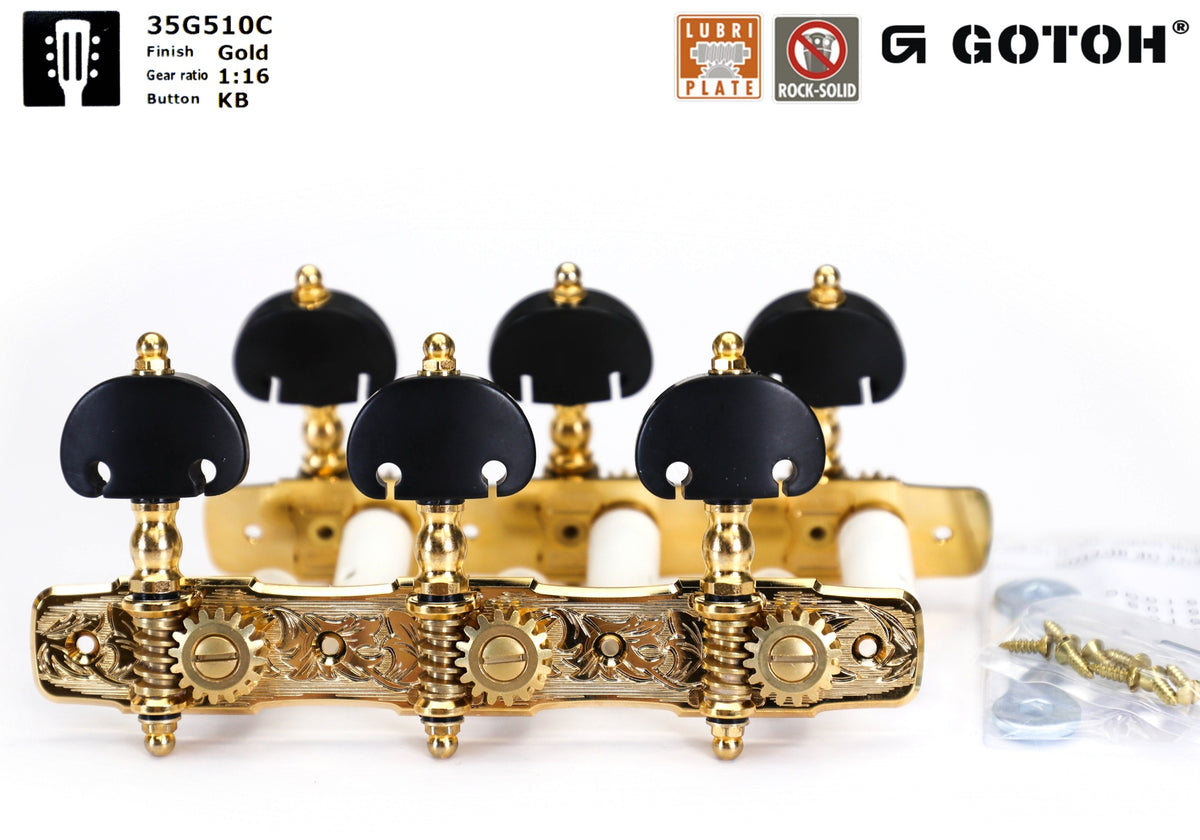 Set of Premium Lubri-Plated Gotoh 35G510 series tuners, Gold plate, Black Plastic Kidney knobs, Plastic Rollers, complete set.