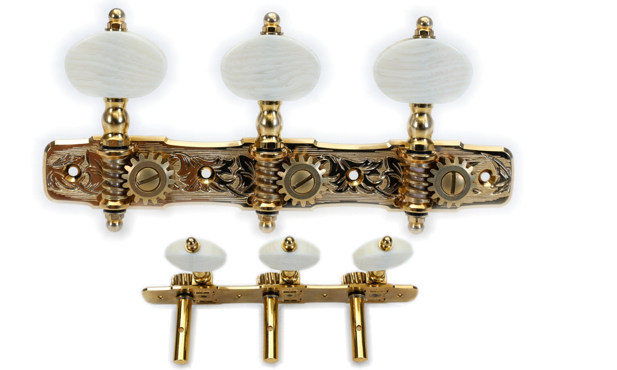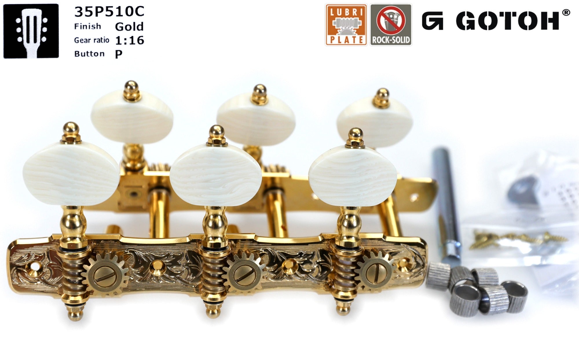 Set of Premium Lubri-Plated Gotoh 35G510 series tuners, Gold plate, White Pearloid Plastic knobs, 6mm Metal Rollers, complete set.