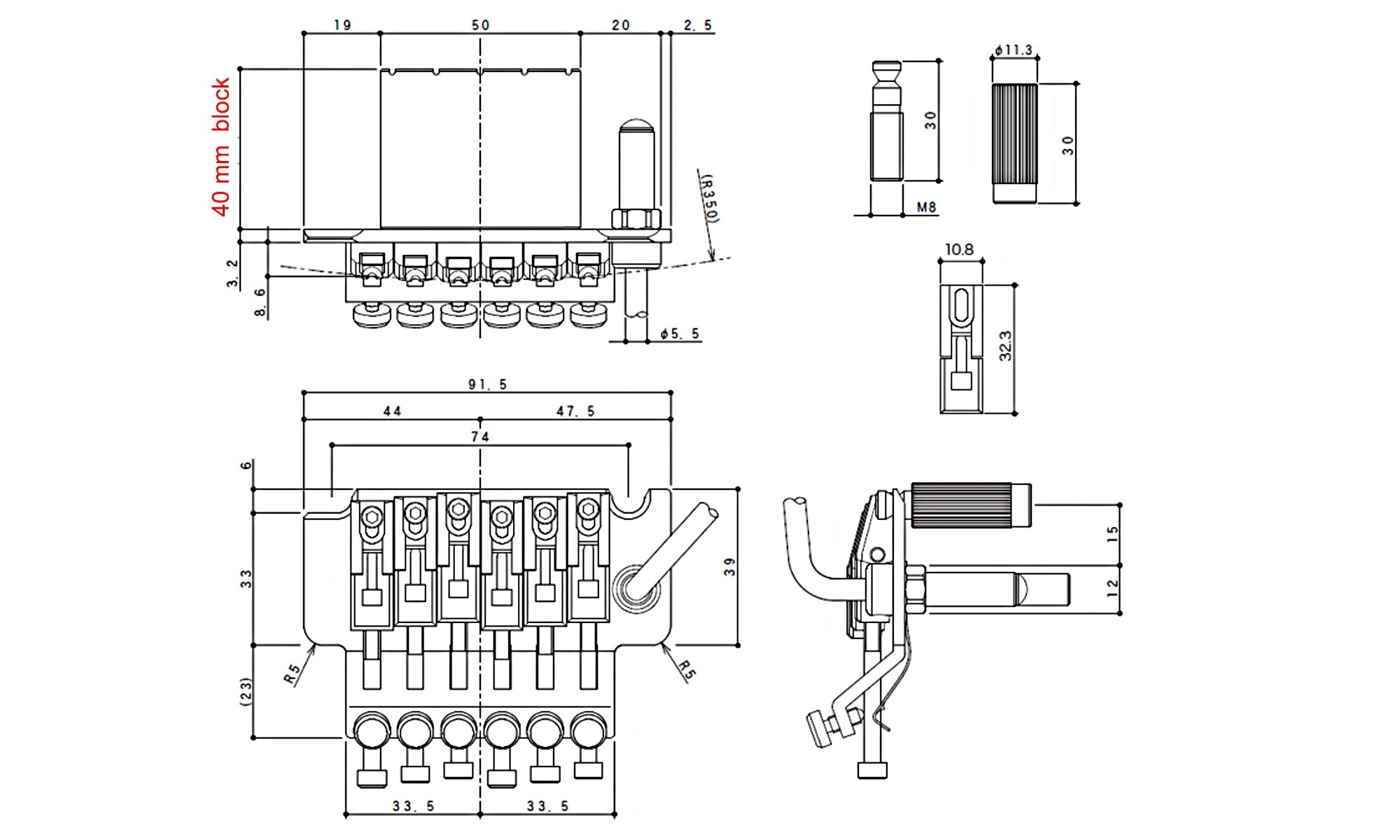 Floyd Rose Locking Tremolo bridge with solid steel saddles and 40mm brass block.