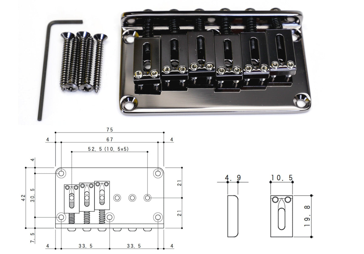 Brass non-tremolo Gotoh GTC101 Hardtail Bridge for Strat-style guitars with through-body strings, in 4 finishes: Black, Cosmo Black, Chrome and Gold.