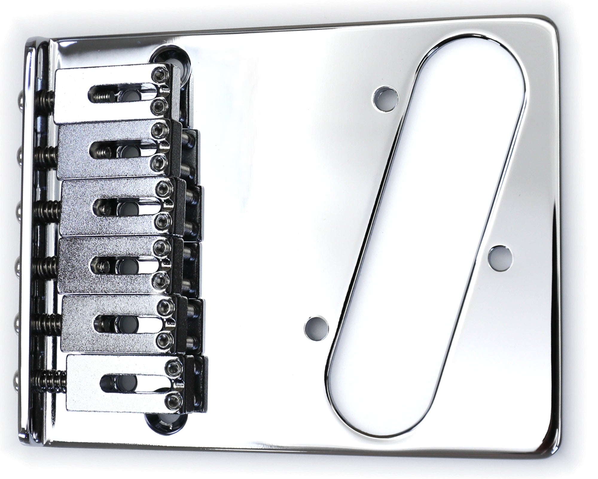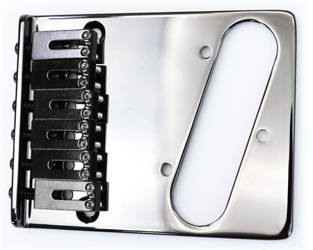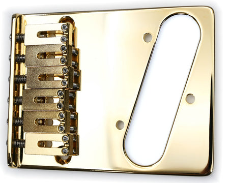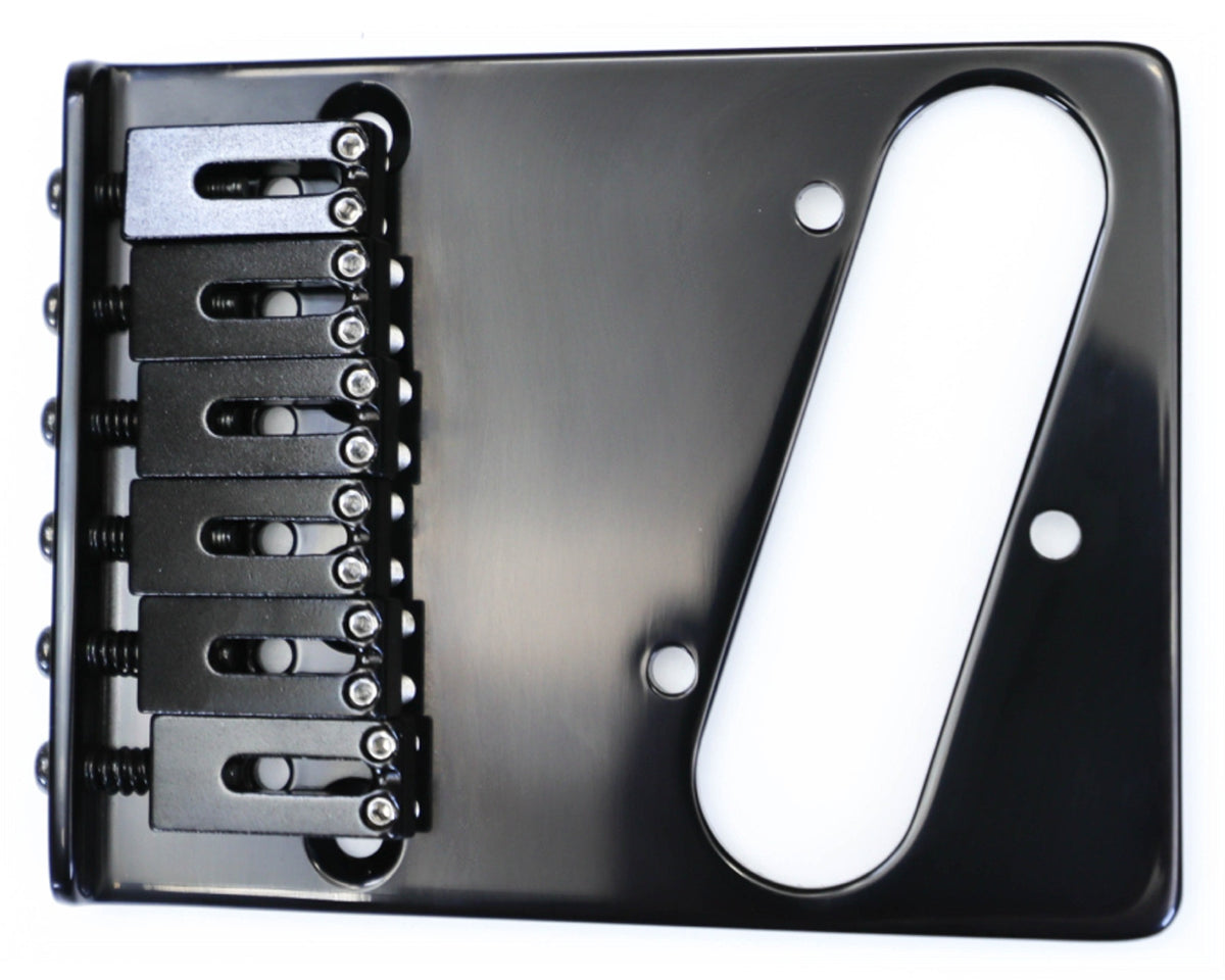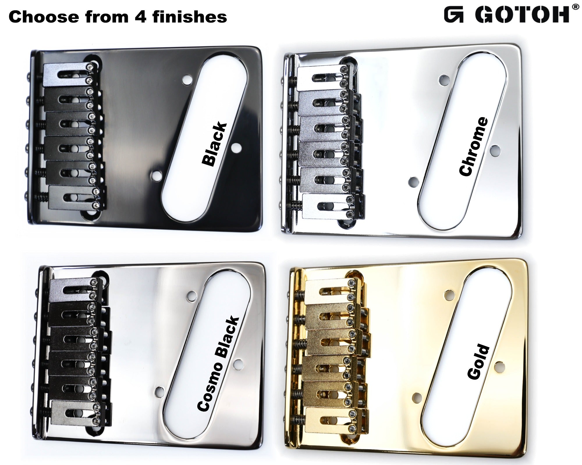 Gotoh GTC202 Steel Modern Tele-style bridge with single-coil pickup mounting and through-body strings, in 4 finishes: Black, Cosmo Black, Chrome and Gold.