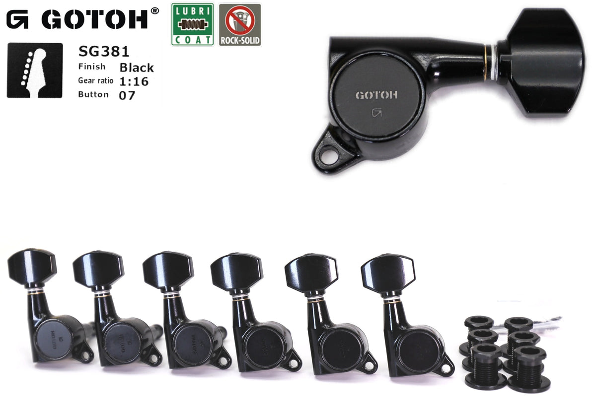 Set of six Gotoh SG381 sealed-gear tuners (6 Left, for Right-handed Guitars), Black finish, with Standard Post.