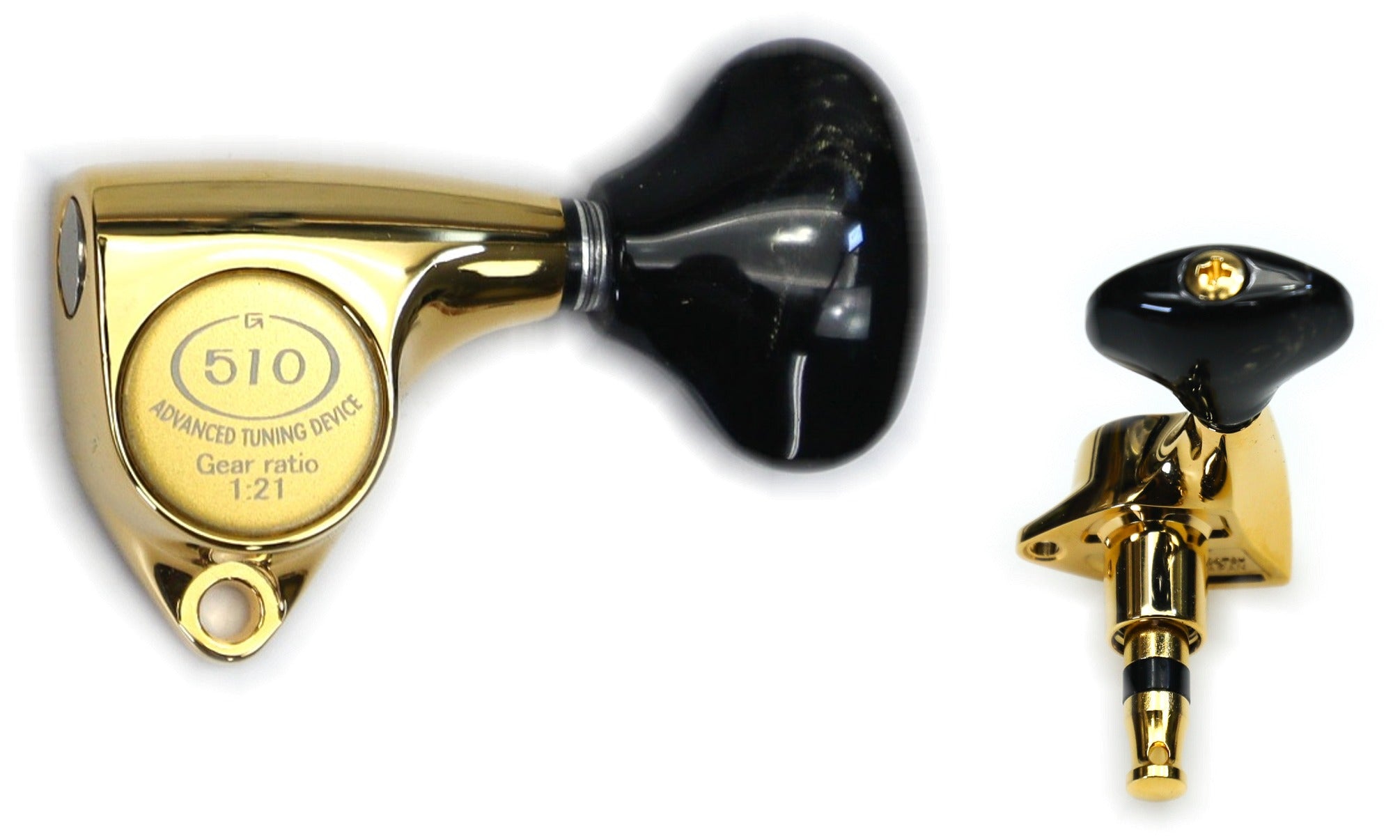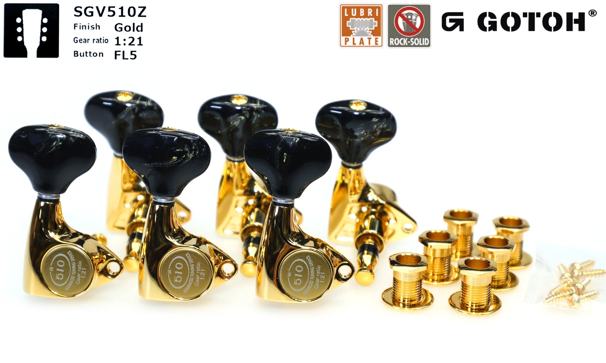 Set of six Premium Lubri-Plated Gotoh SGV510Z series sealed-gear tuners (3L+3R), Gold finish, Black Plastic knobs.